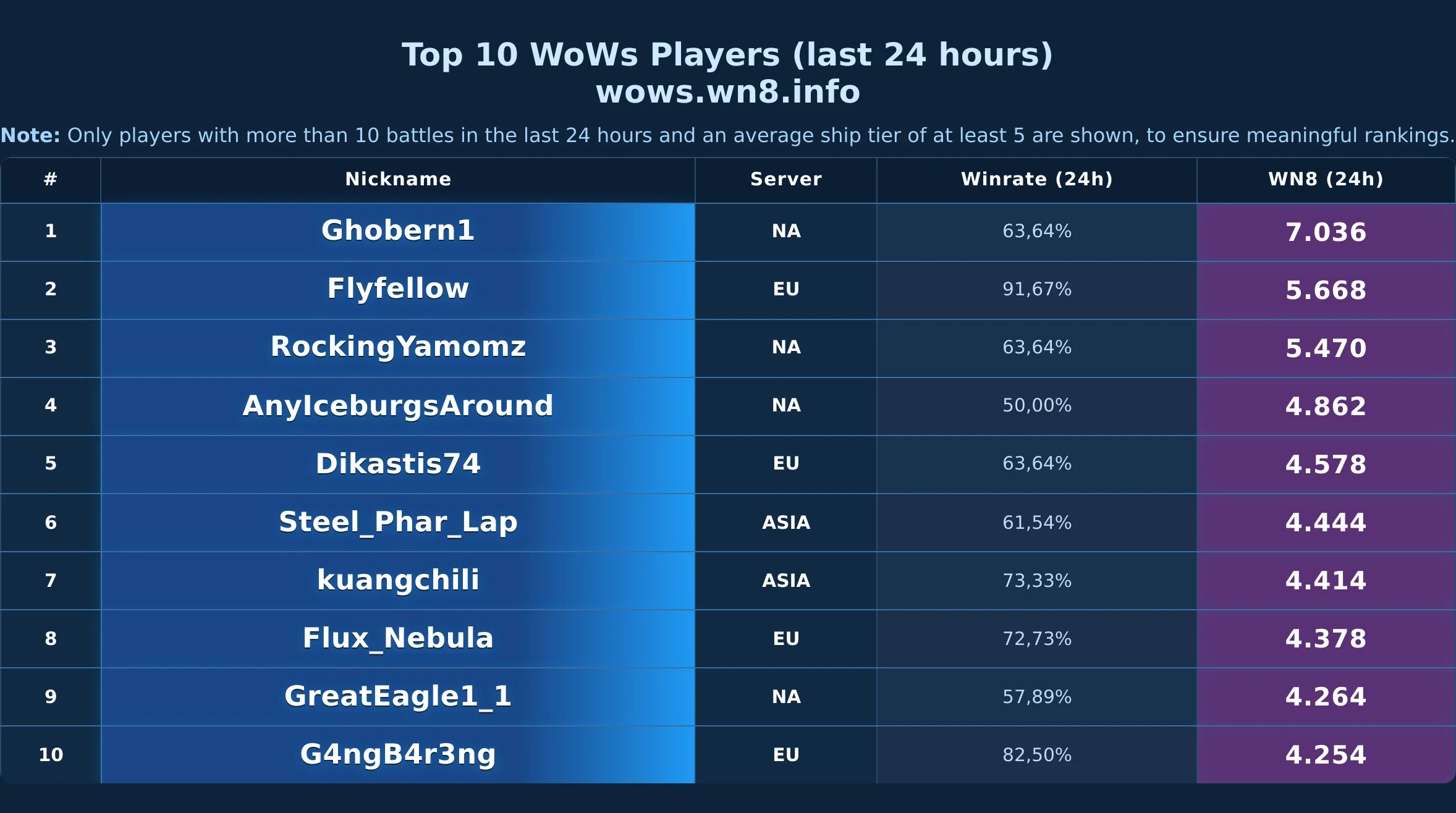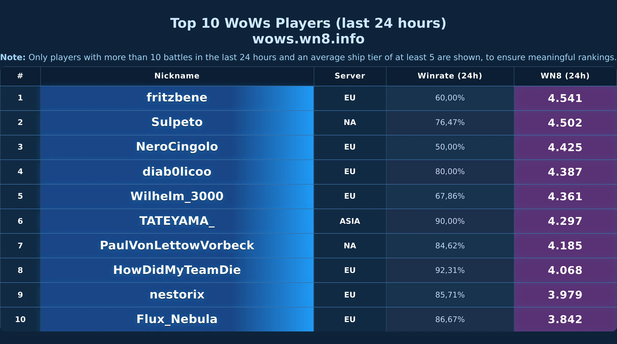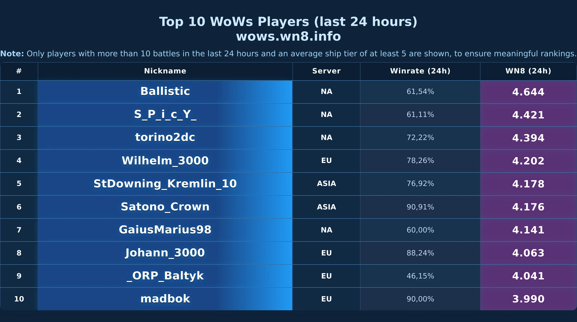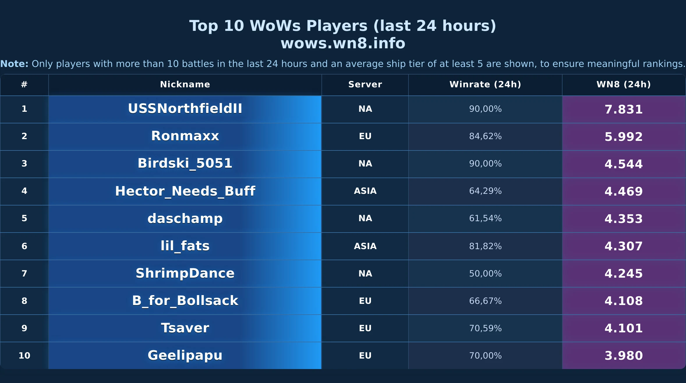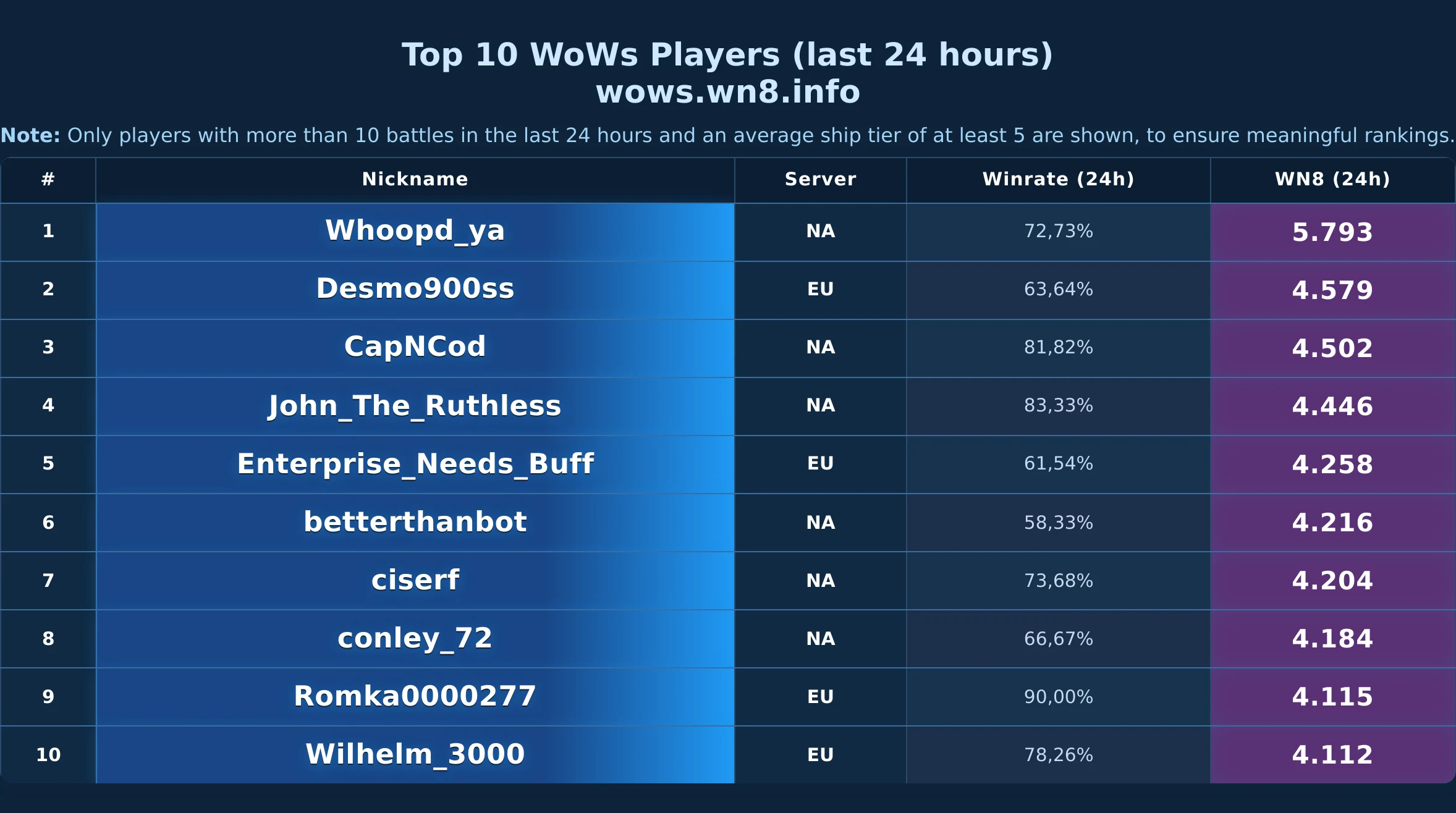 Daily snapshot of the WOWS Top-10 (24h).