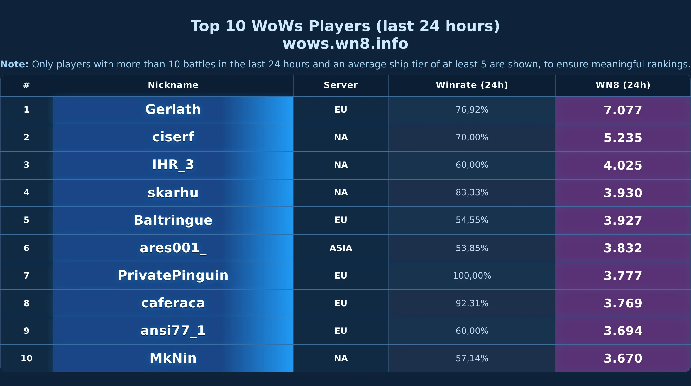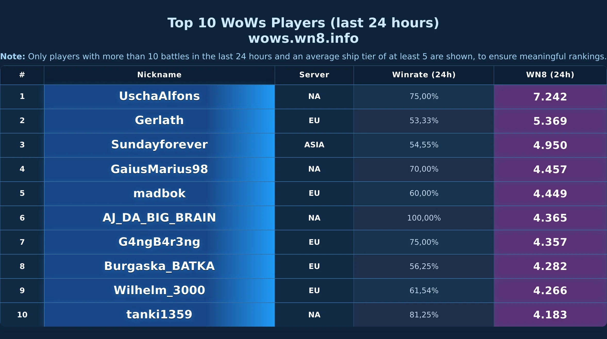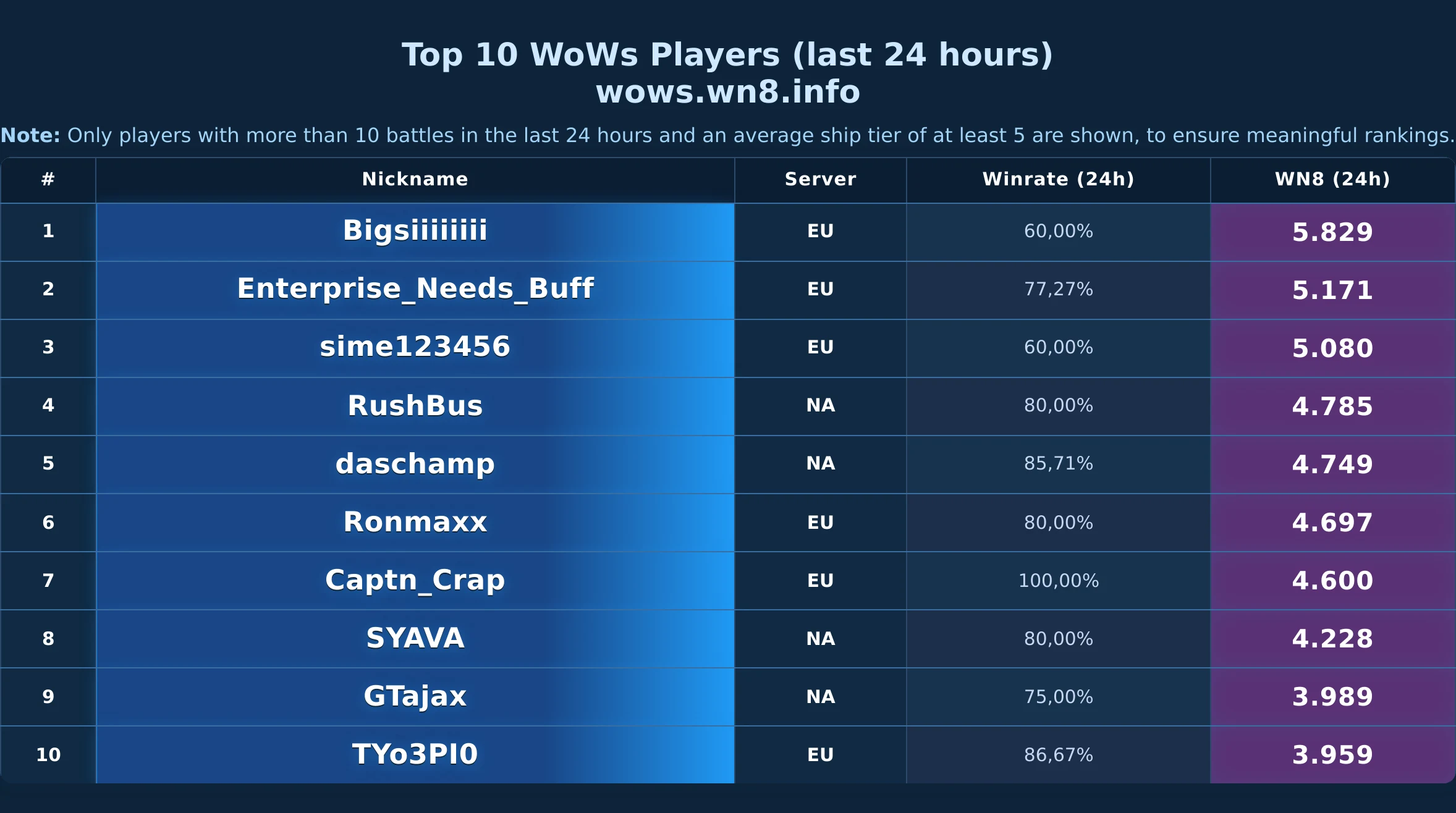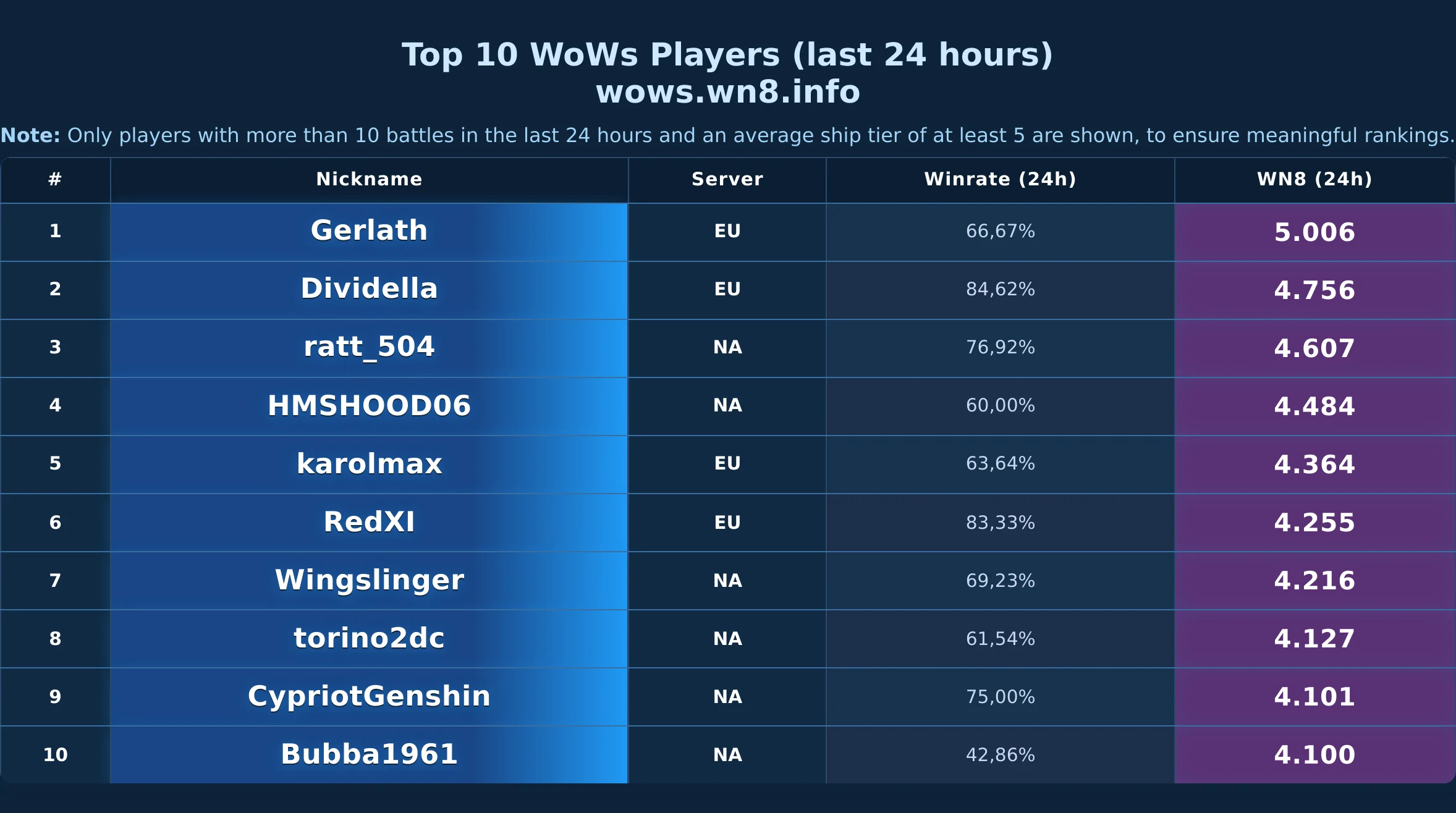 Daily snapshot of the WOWS Top-10 (24h).