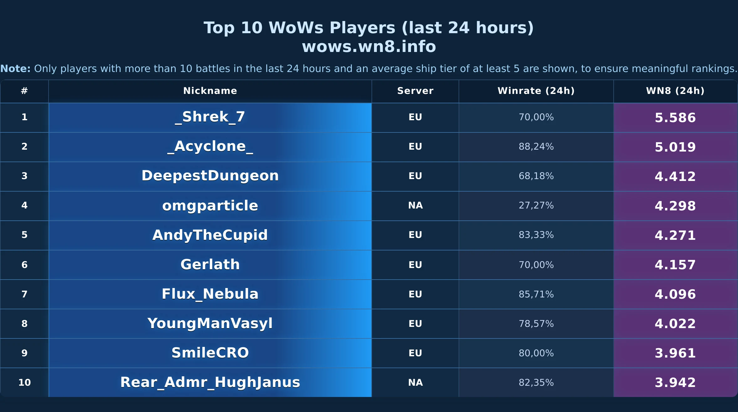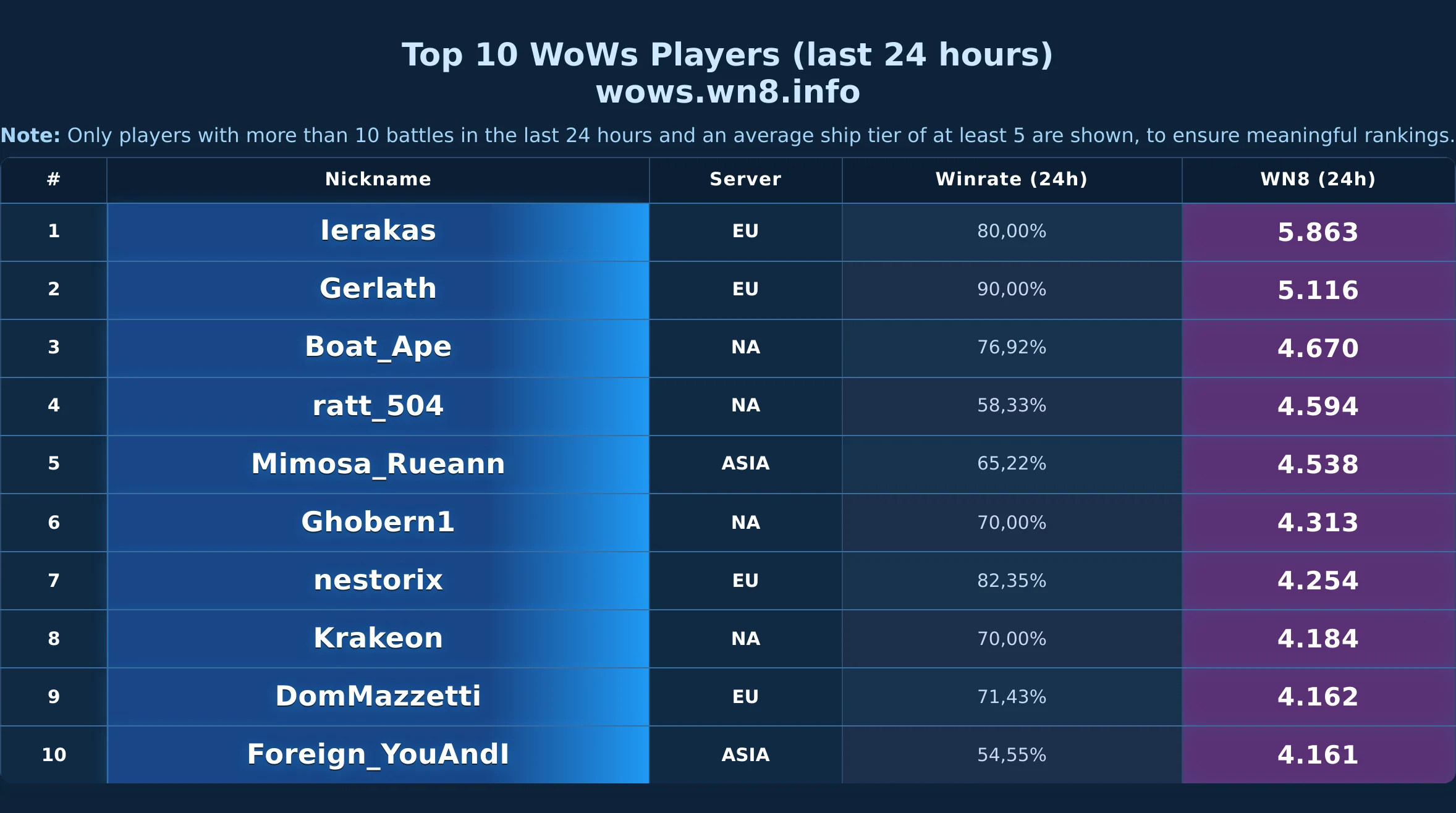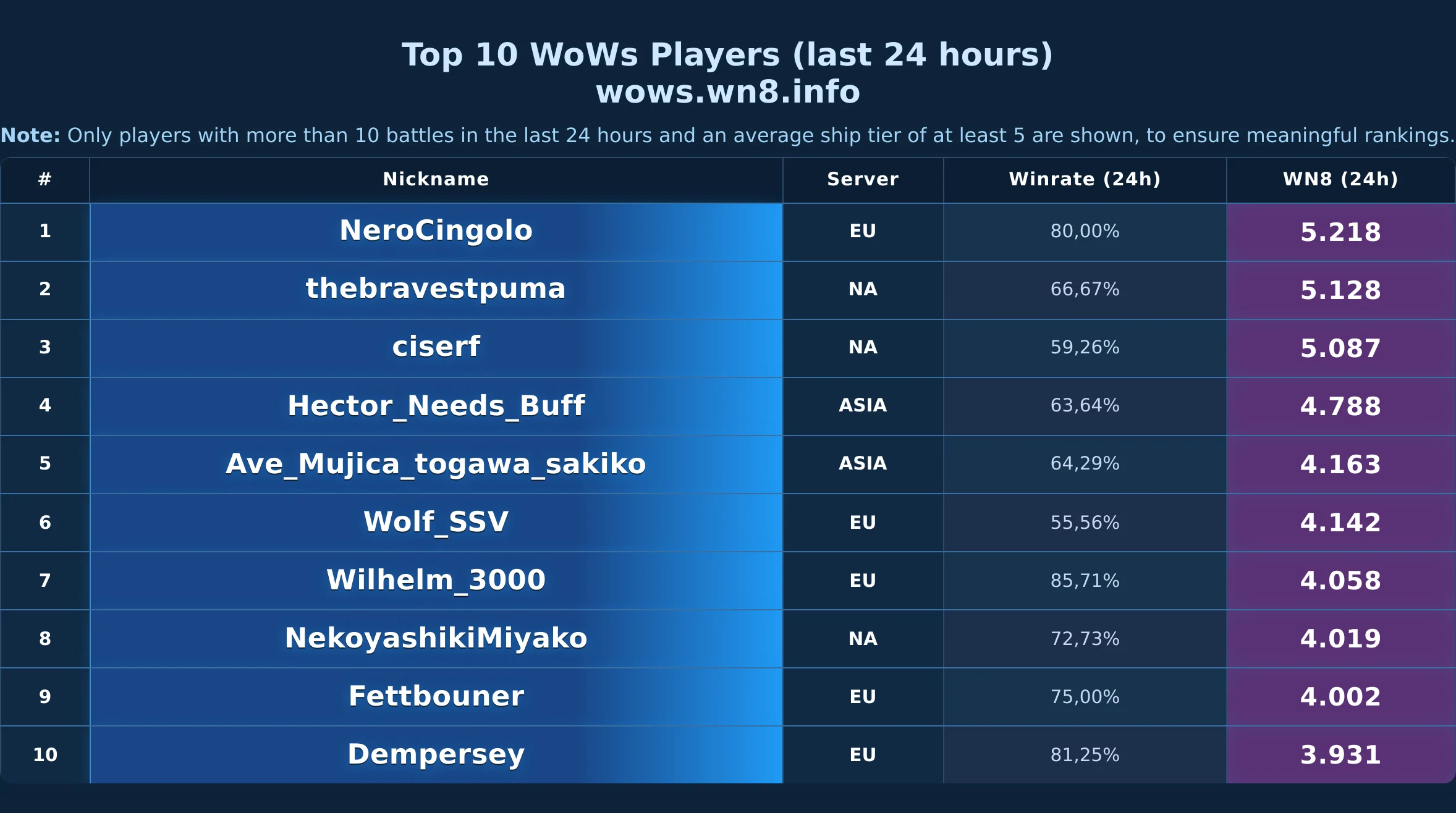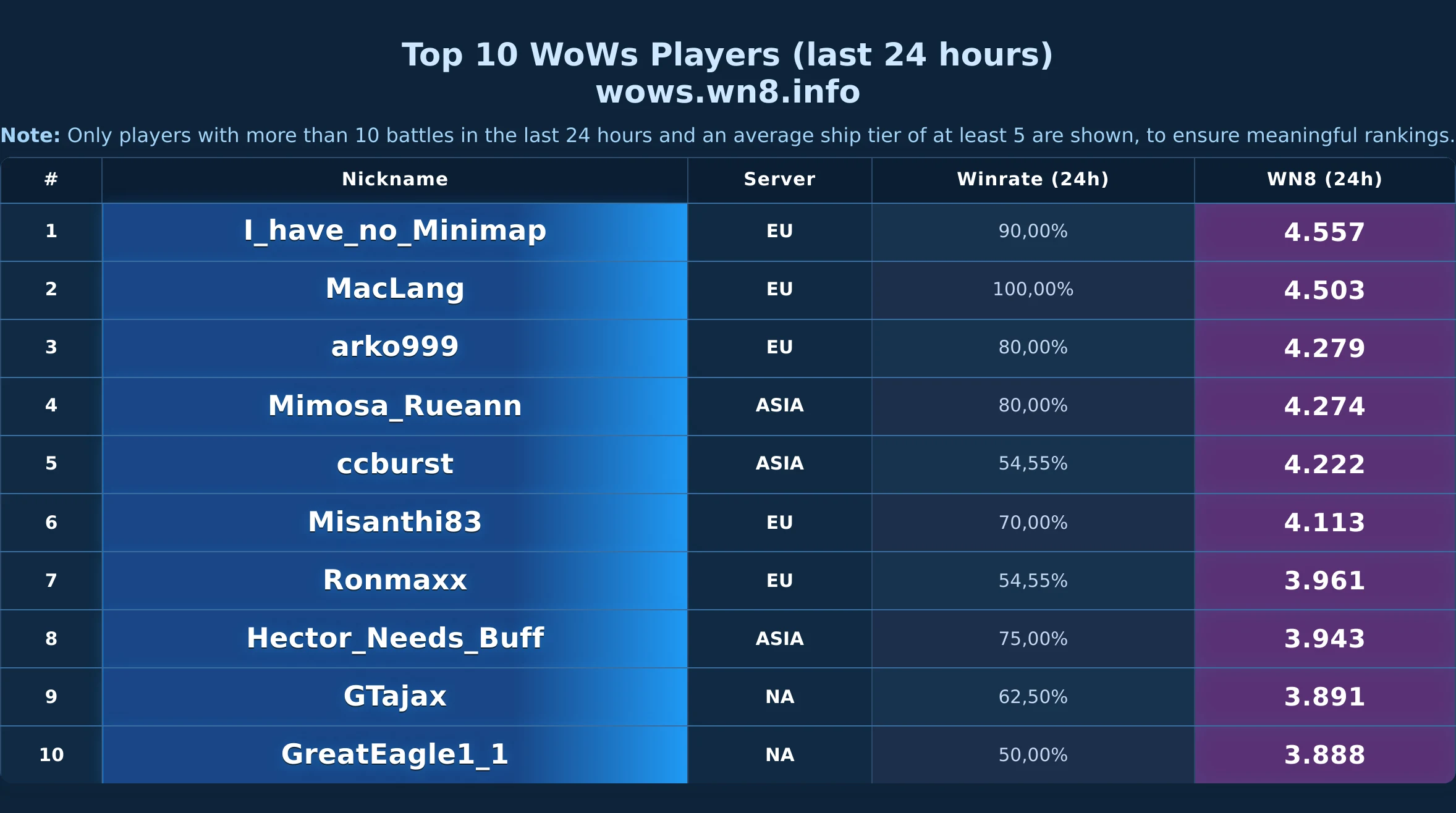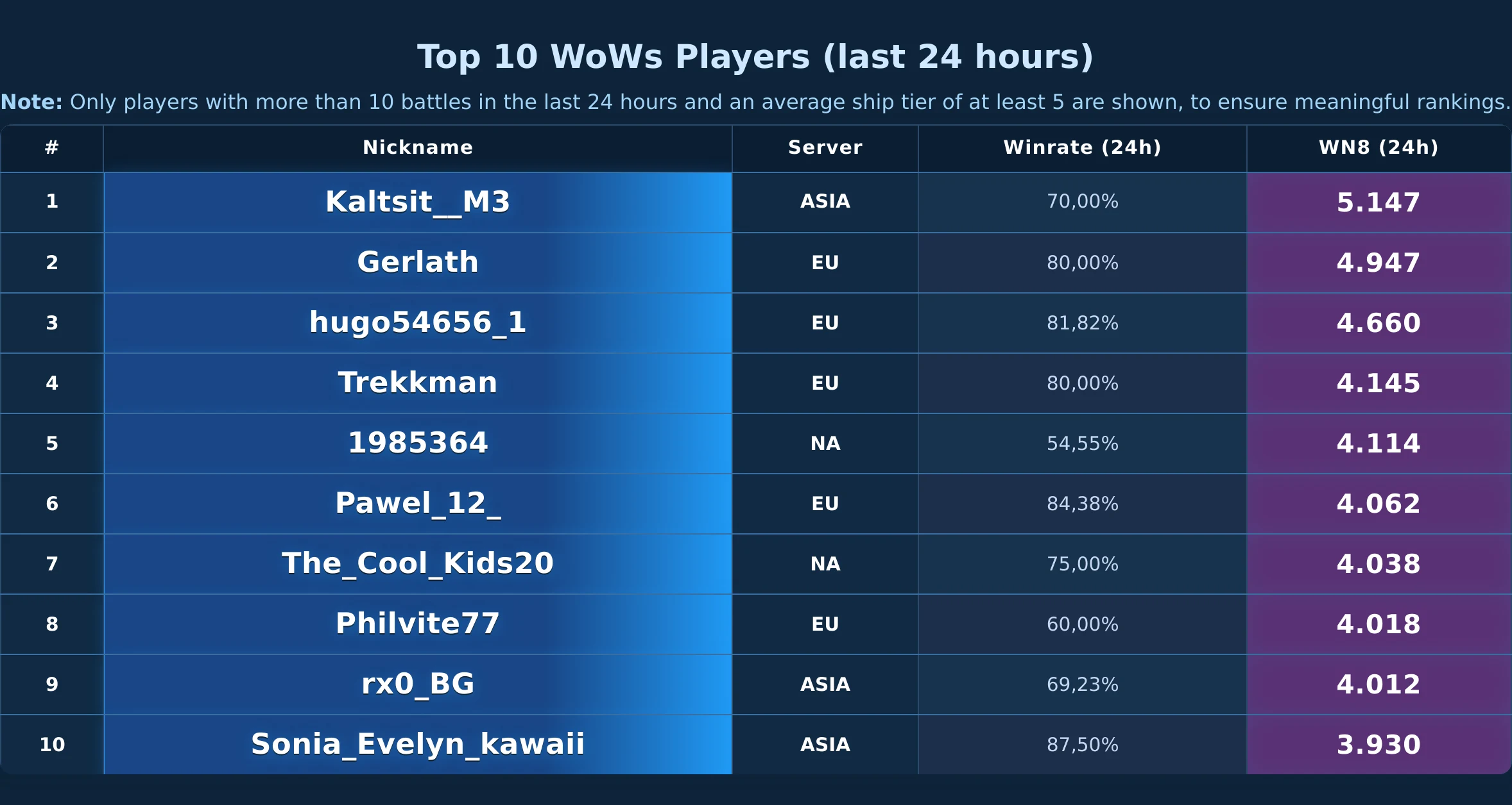 Daily snapshot of the WOWS Top-10 (24h).
