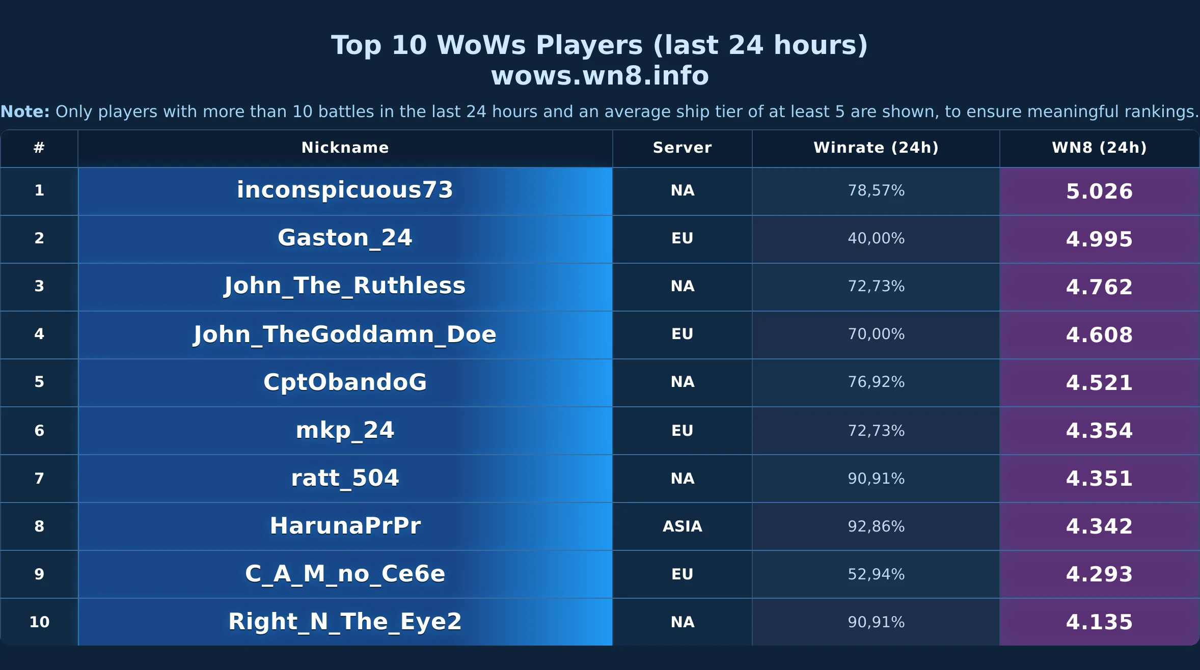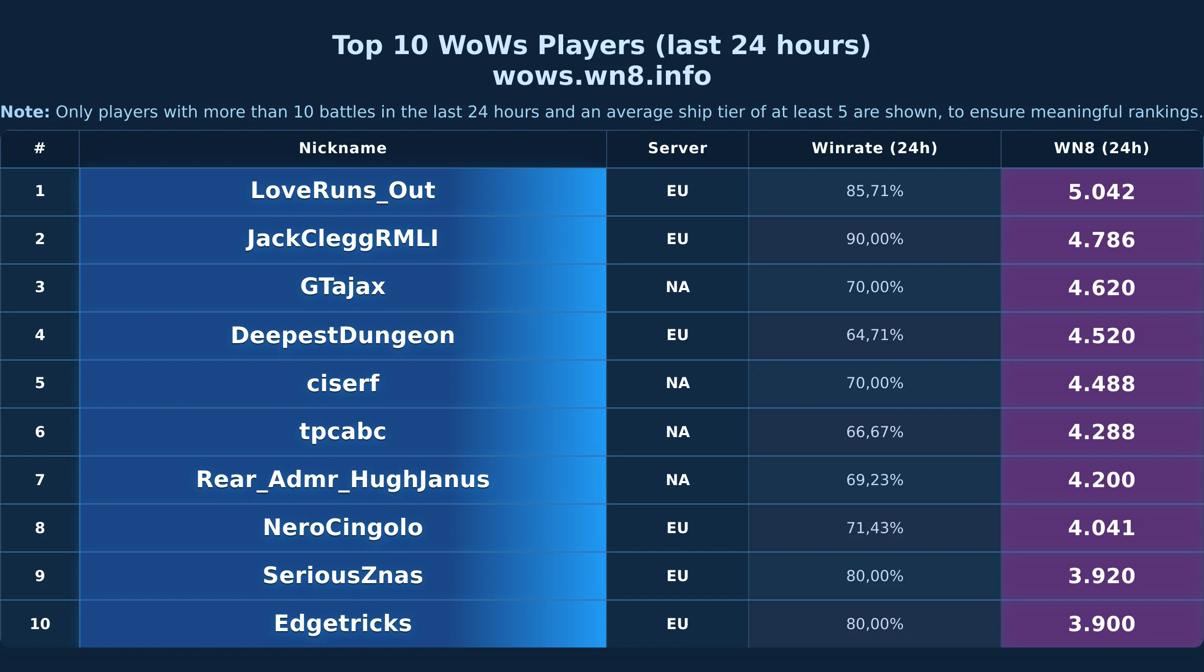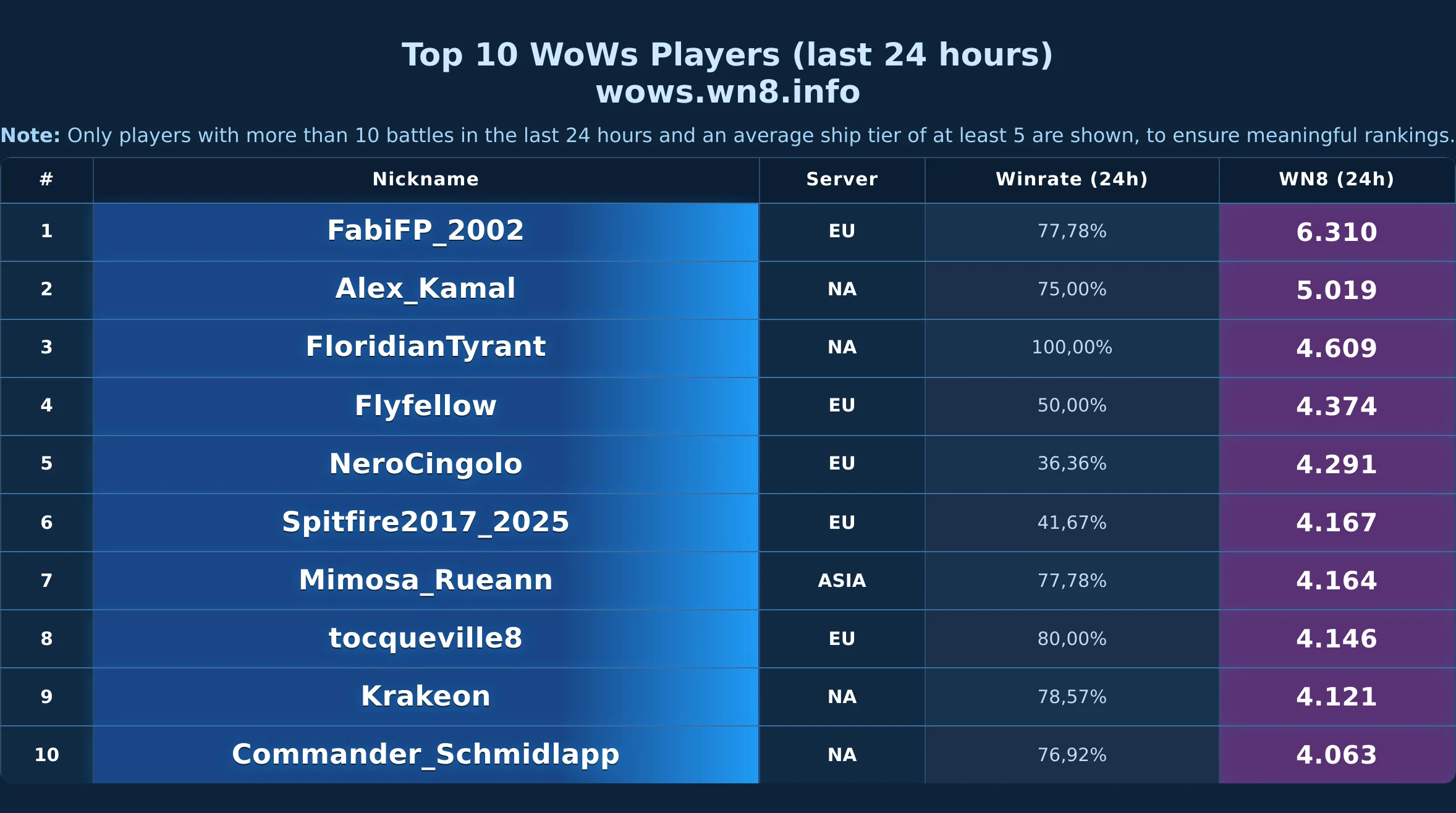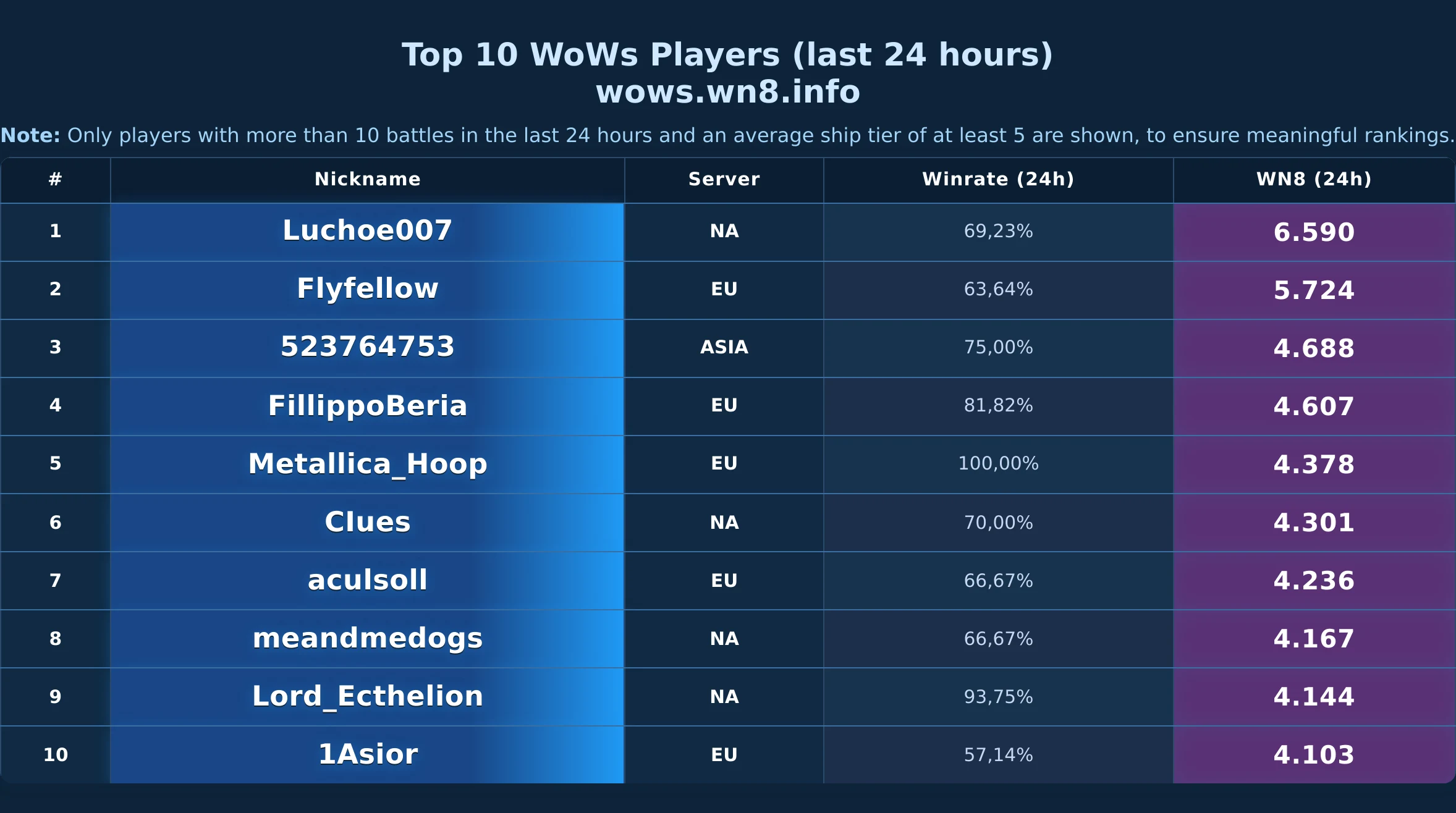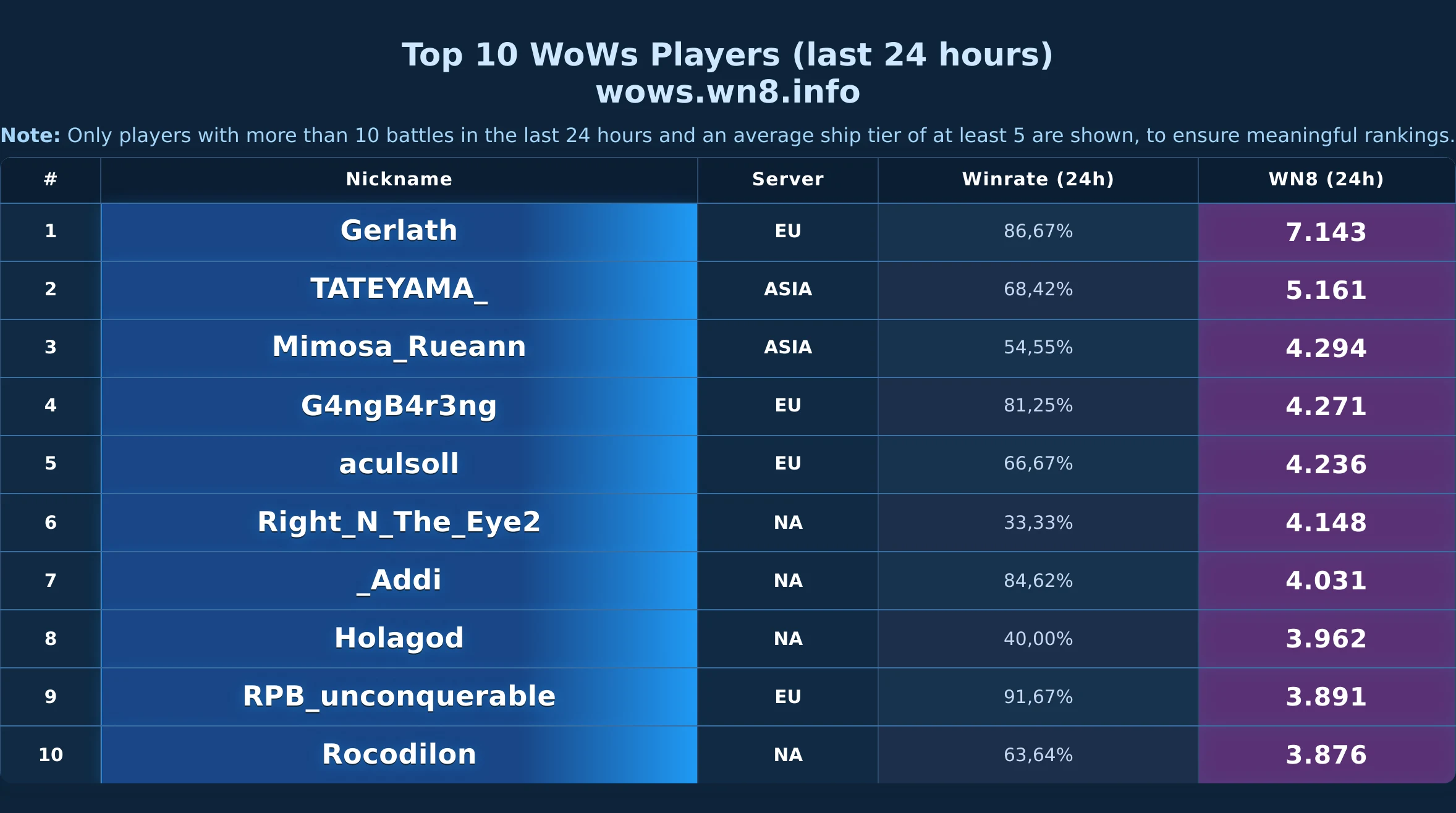 Daily snapshot of the WOWS Top-10 (24h).